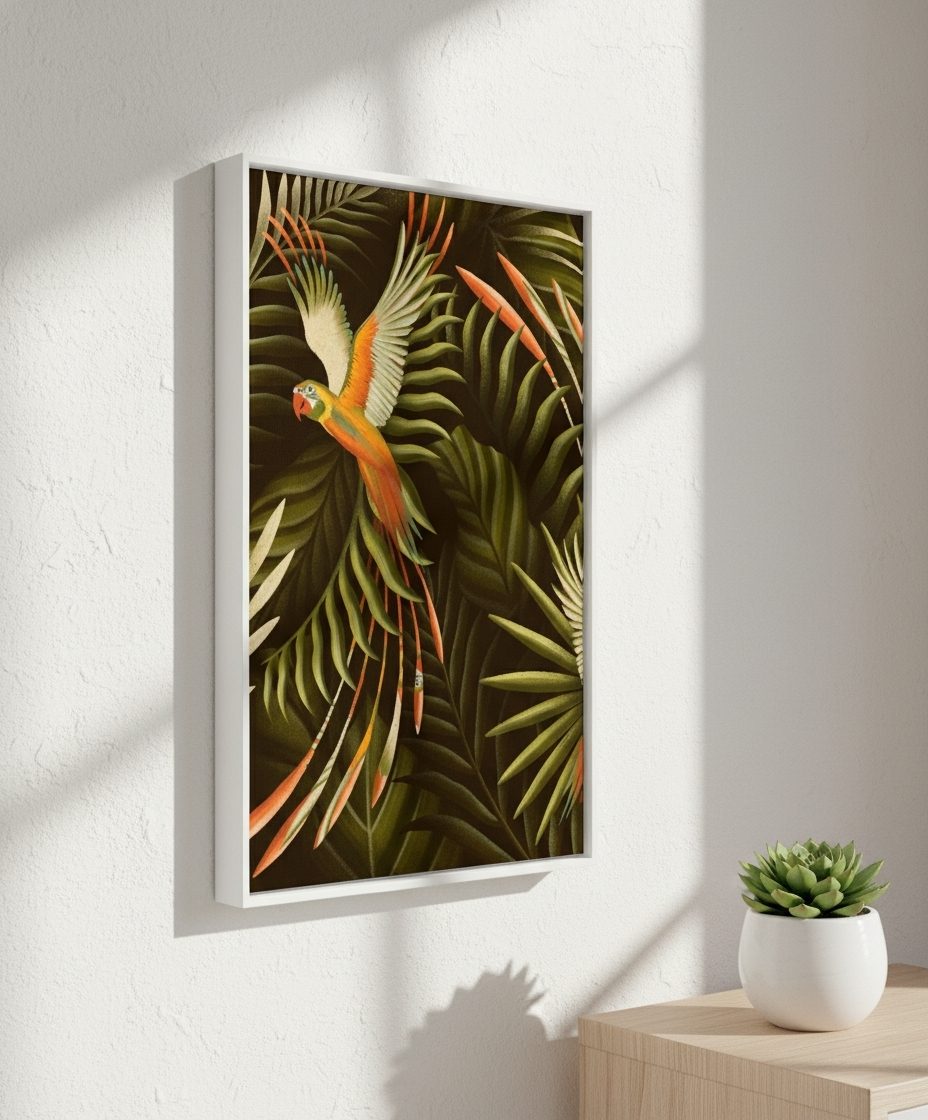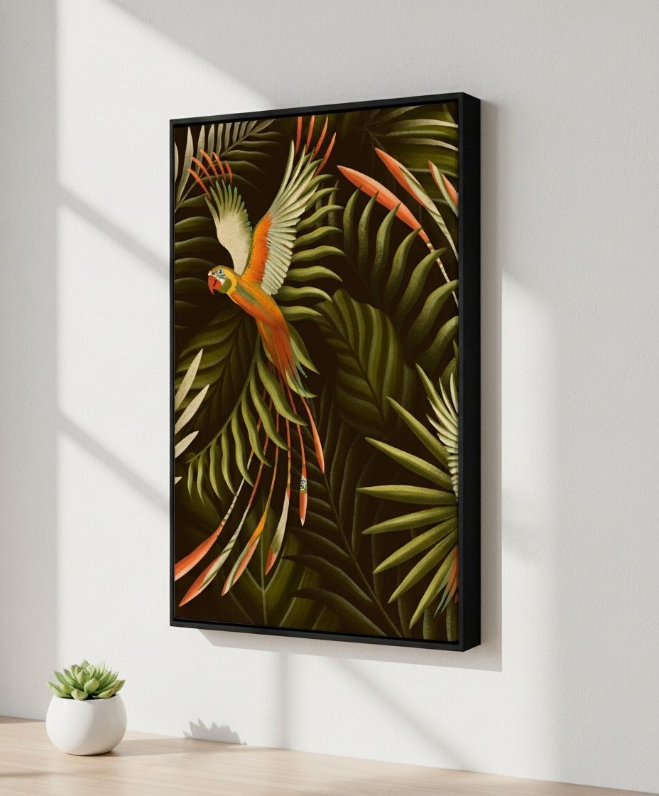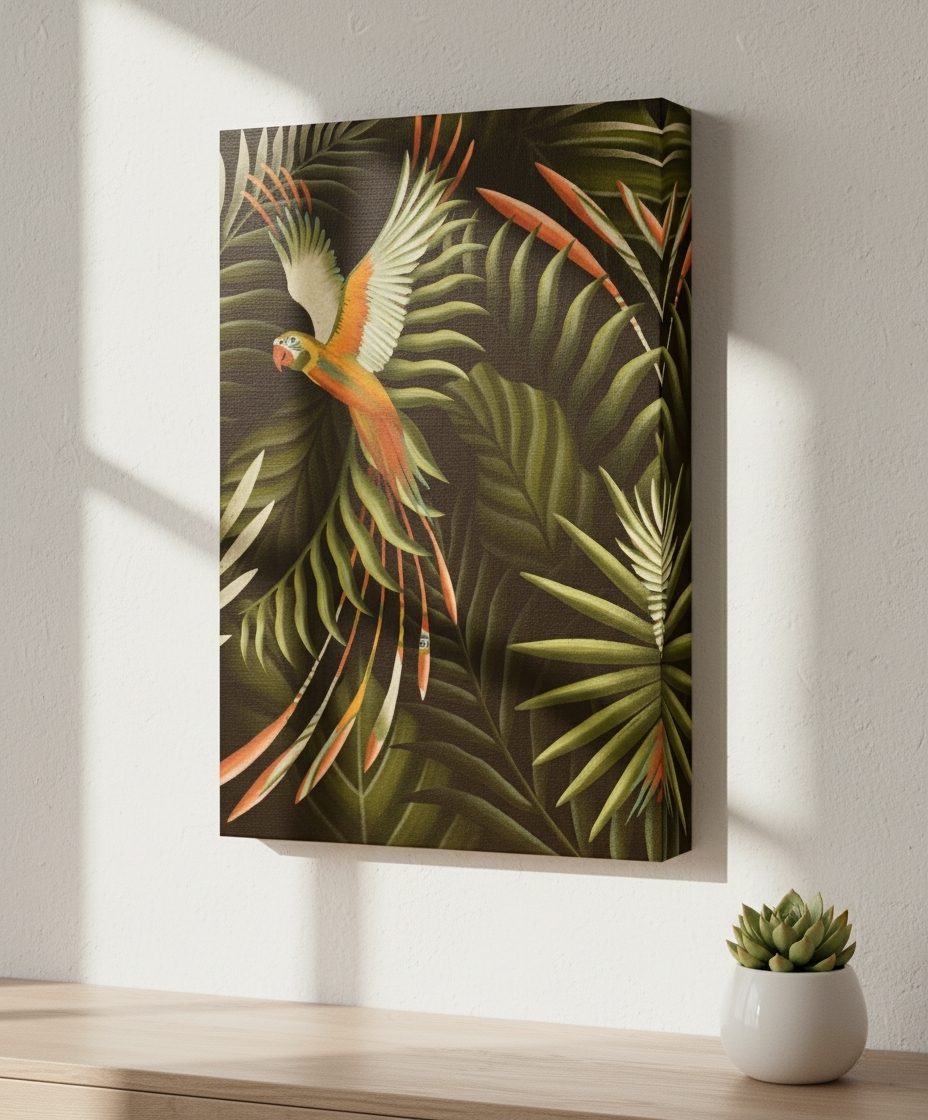 A obra “Botanical Farm” é um mergulho visual na exuberância tropical, onde folhas densas e pássaros coloridos se entrelaçam em movimento e liberdade.