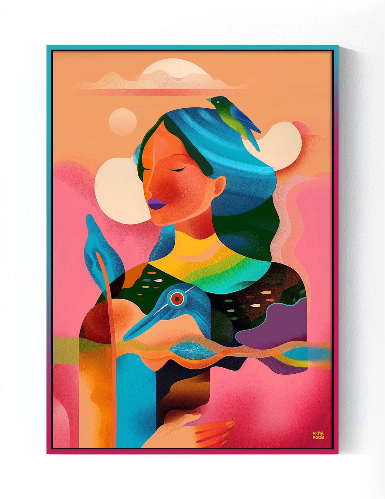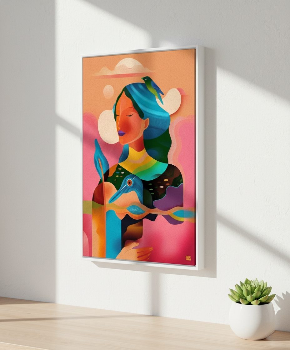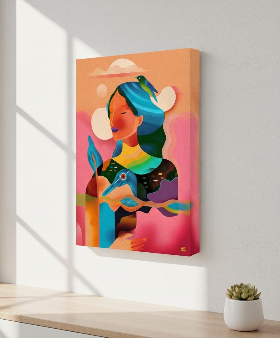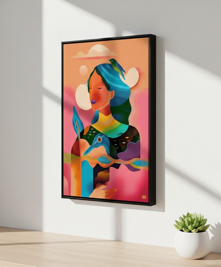 Produzida em tela canvas premium, “Mãe Pássaro” utiliza impressão com tinta látex de longa durabilidade, em tela canvas premium 100% algodão, moldura em madeira, garantindo alta definição, resistência e acabamento elegante.
