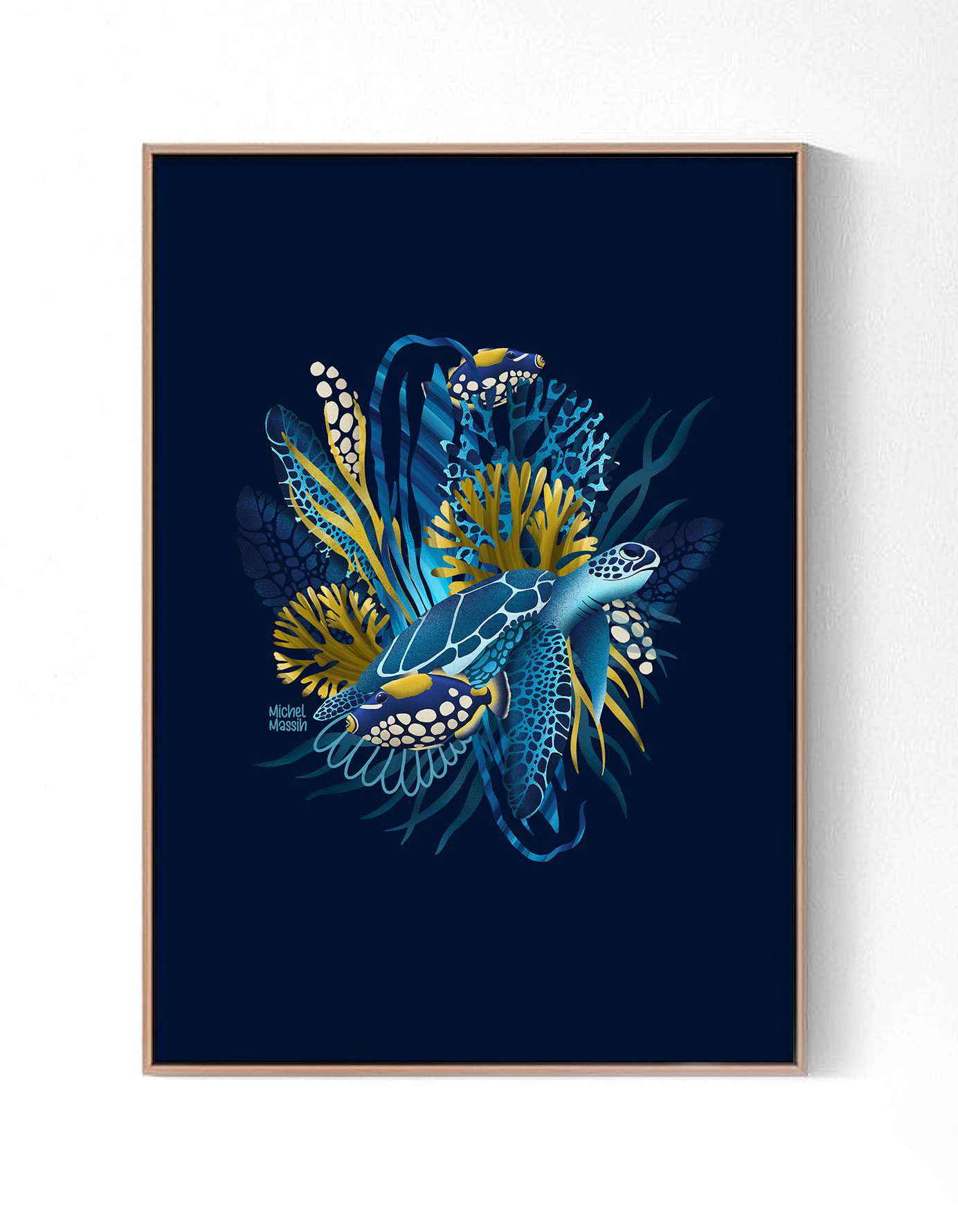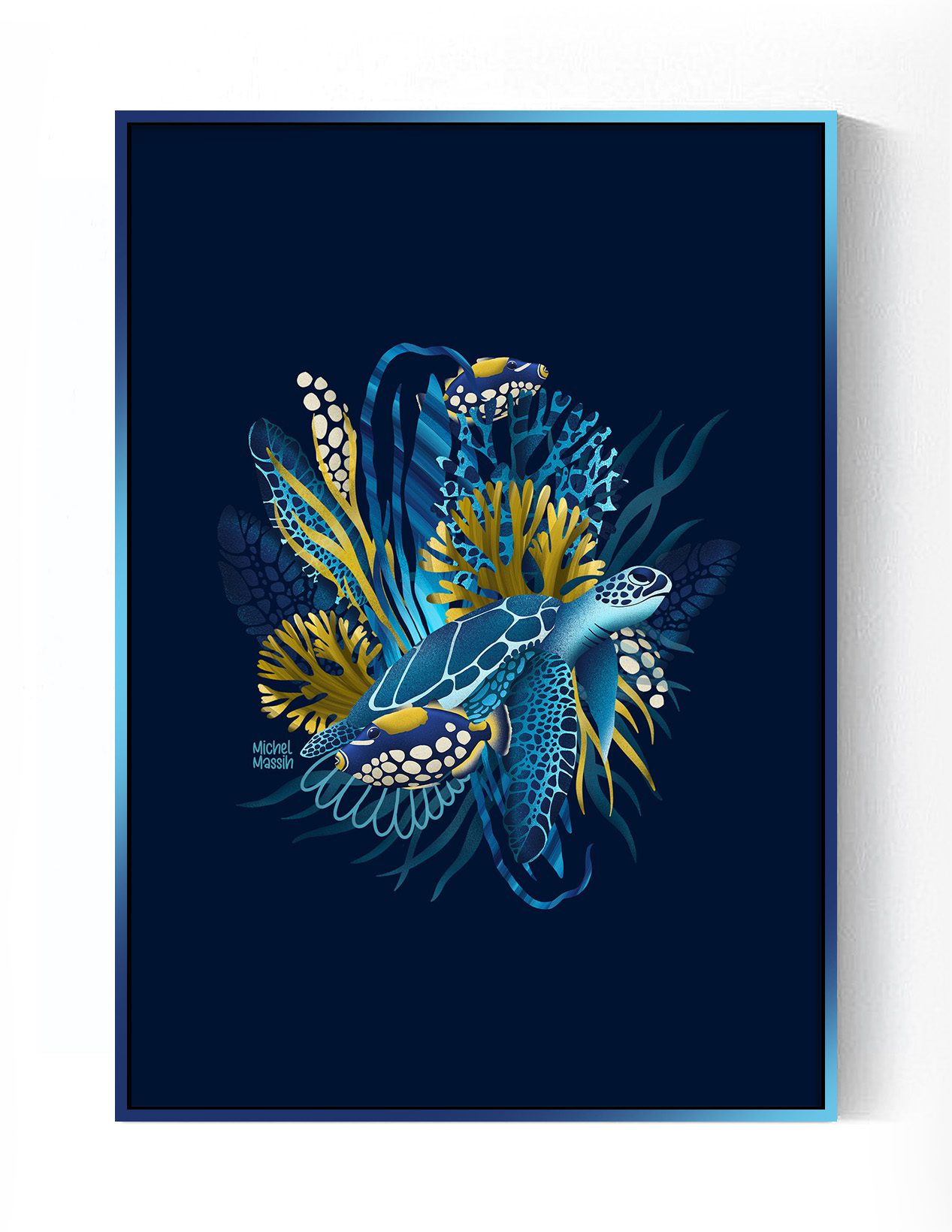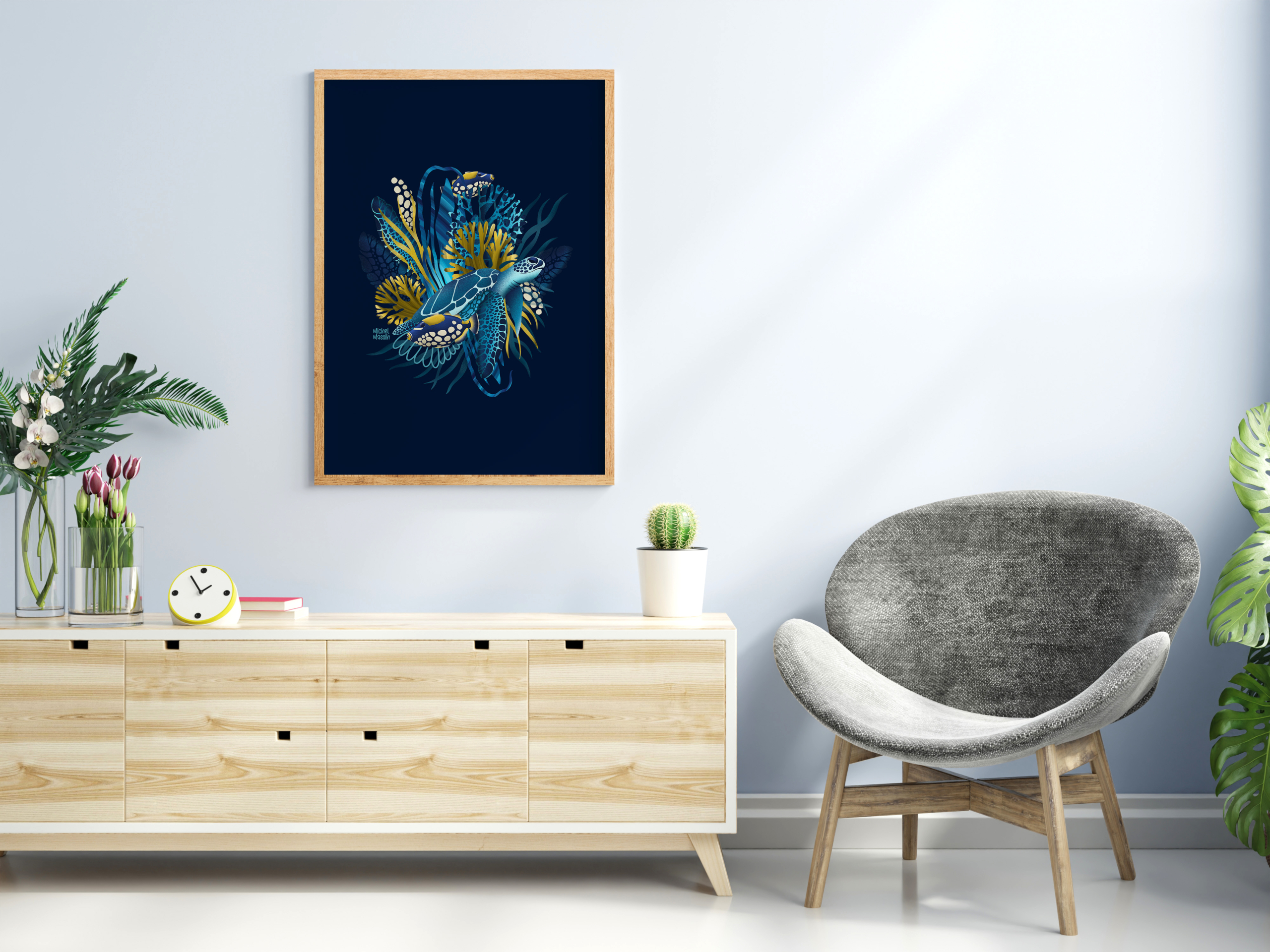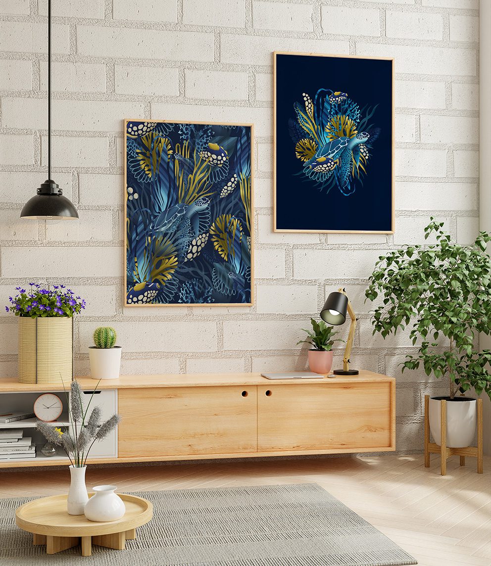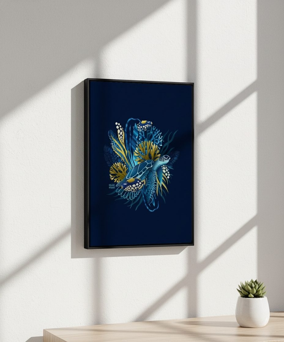 A moldura acompanha o estilo elegante da obra, valorizando o contraste entre o azul intenso e os elementos marinhos dourados.