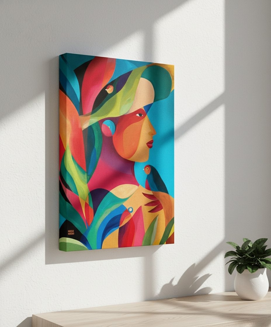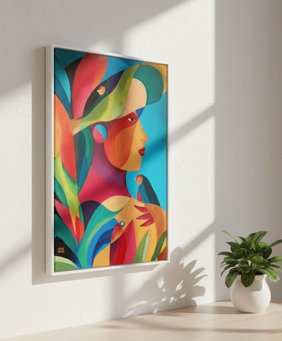 Produzida em tela canvas premium, “Tarsilla” utiliza impressão com tinta látex de longa durabilidade, em tela canvas premium 100% algodão, moldura em madeira, garantindo alta definição, resistência e acabamento elegante.